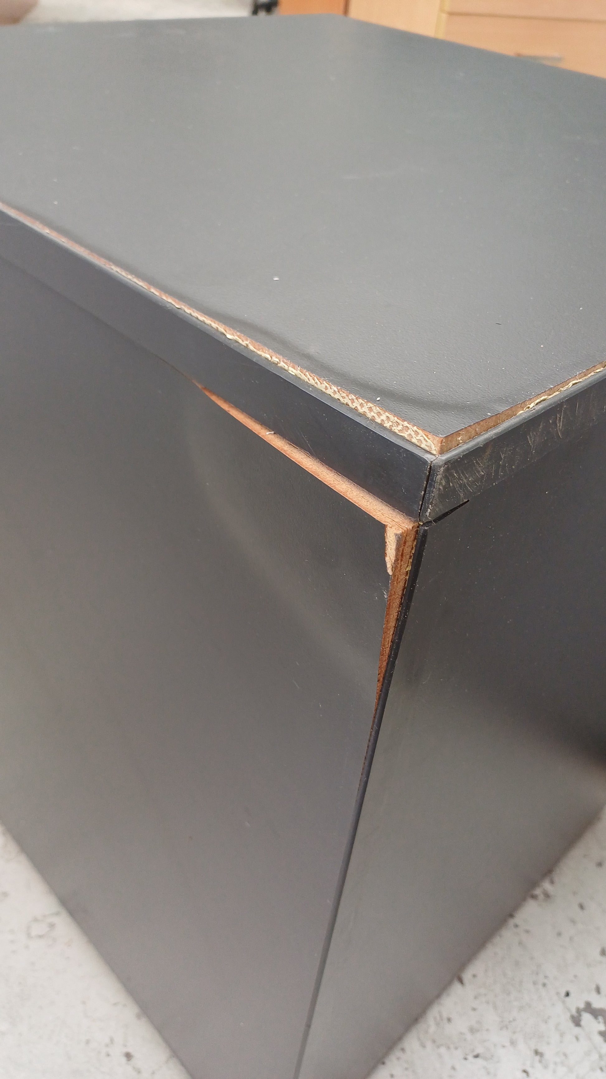 Damage includes scratches on the upper back of cabinet, as well as chipped paint, adhesive residue. Also, as pictured, the upper back siding on the right, the wooden frame came off on the corner, and the lock is broken.